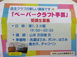 この講座は現在、主催講座として開いている「クラフト手芸」(第1・3木曜、13:30~15:00)の夜のバージョンとなります。